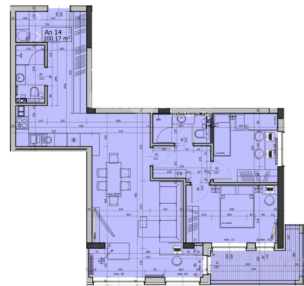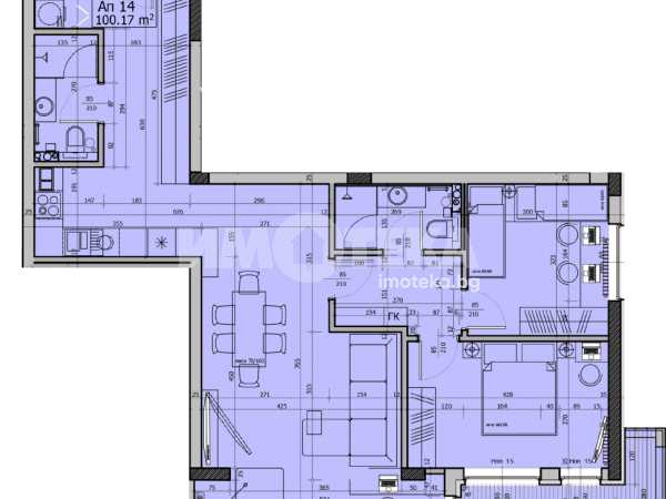 Разпределние: Две спални, дневна с кунхенски бокс, две бани с тоалетни, мокро помещение и тераса.