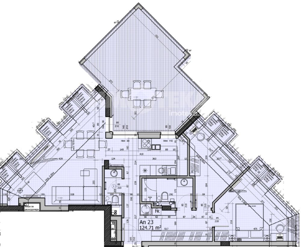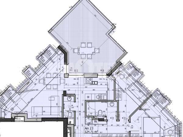 Разпределние: Две спални, дневна с кунхенски бокс, две бани с тоалетни, мокро помещение и тераса.