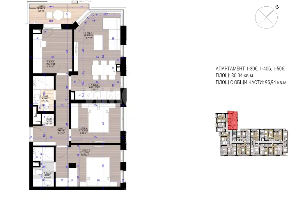Без комисиона. Многостаен апартамент със застроена площ от 97.45 кв.м. Изложението е североизточно. Състои се от хол с трапезария и кухненски бокс, три спални, две бани, перално помещение, тераса и антре.