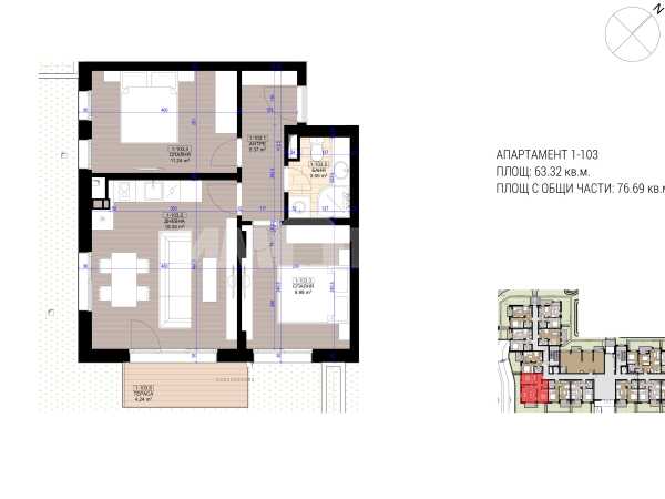 Без комисиона. Партерен тристаен апартамент с дворче. Застроената му площ е 63.32 кв.м. Южно изложение. Състои се от хол с трапезария и кухненски бокс, две спални, санитарно помещение, тераса и антре.