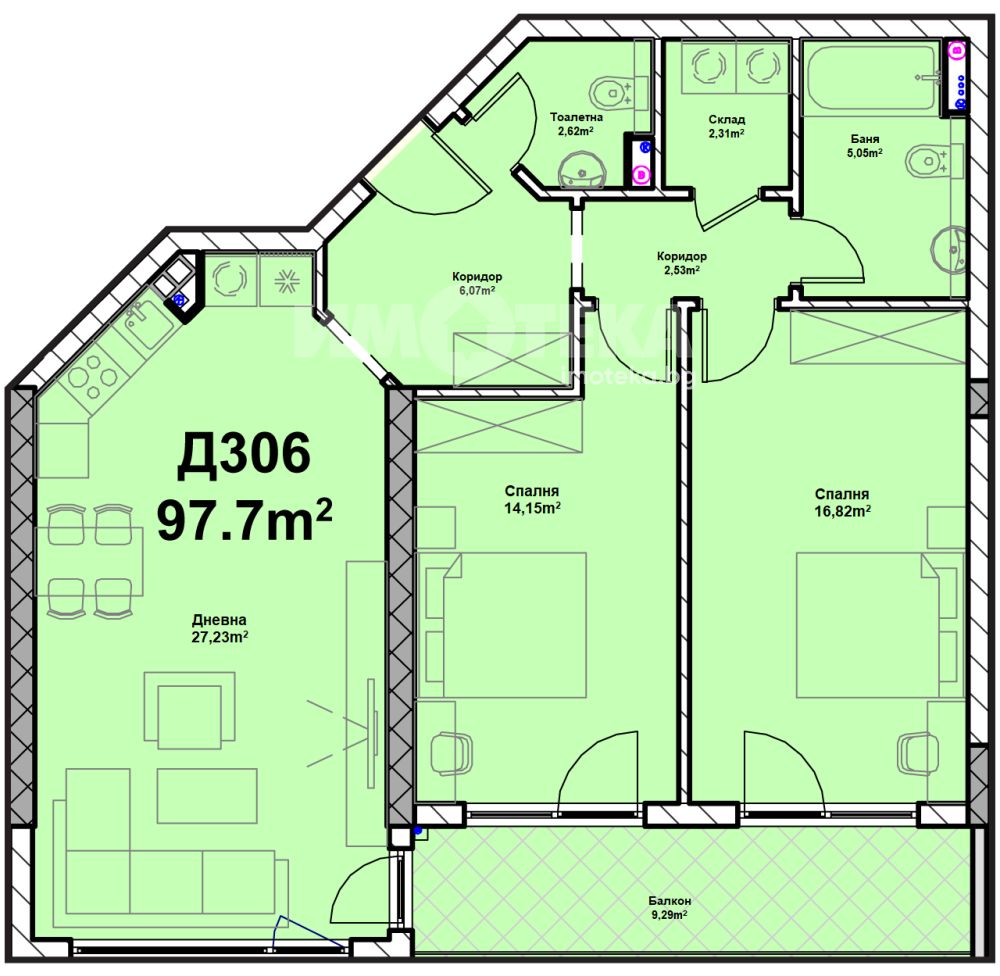 Тристаен апартамент със застроена площ от 97.70 кв.м. РЗП-115,96м2. Разположен е на ЧЕТВЪРТИ етаж. Състои се от: антре, дневна с кухненски бокс и трапезария, две спални, баня с тоалетна, отделна тоалетна, склад и балкон.