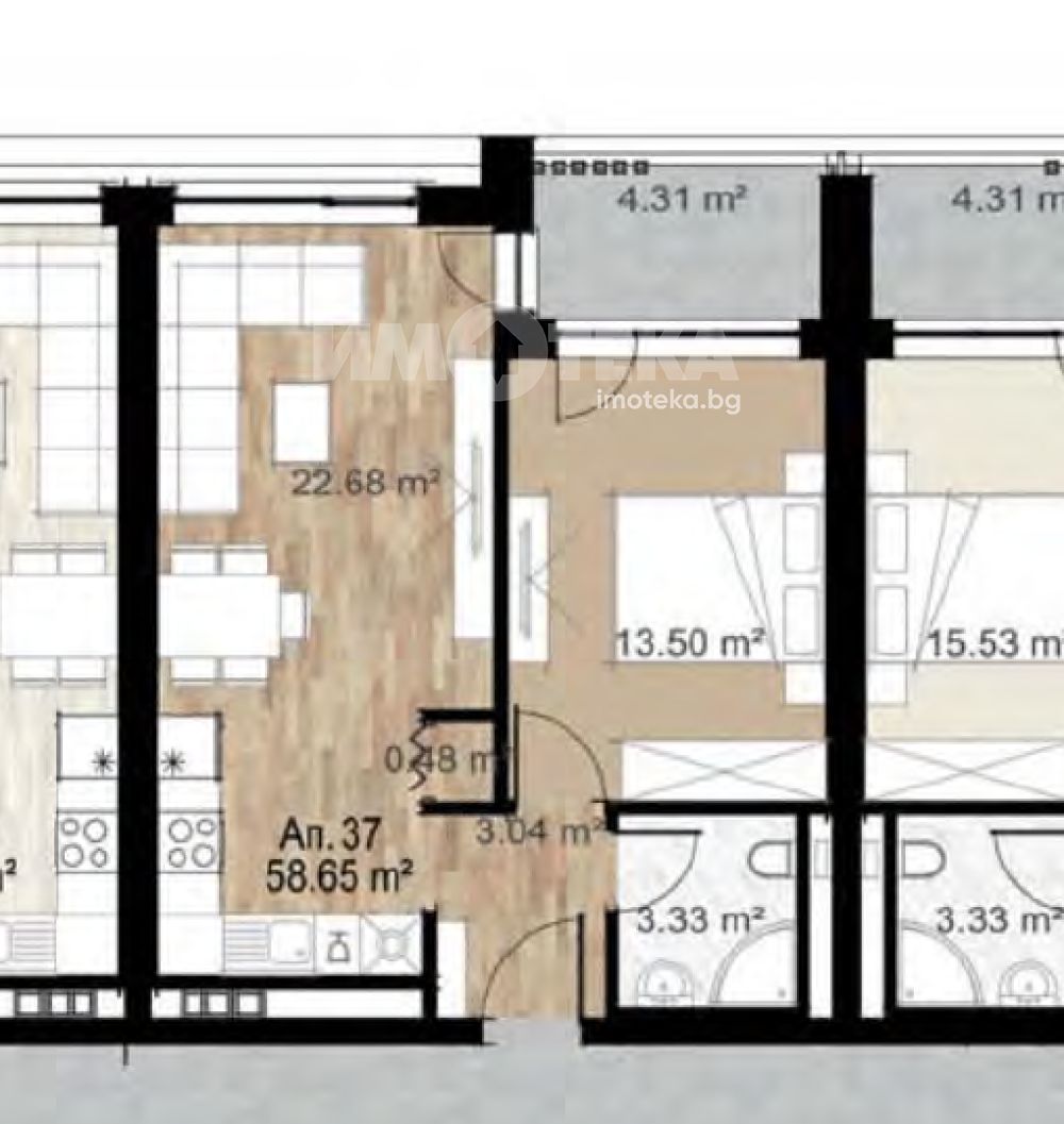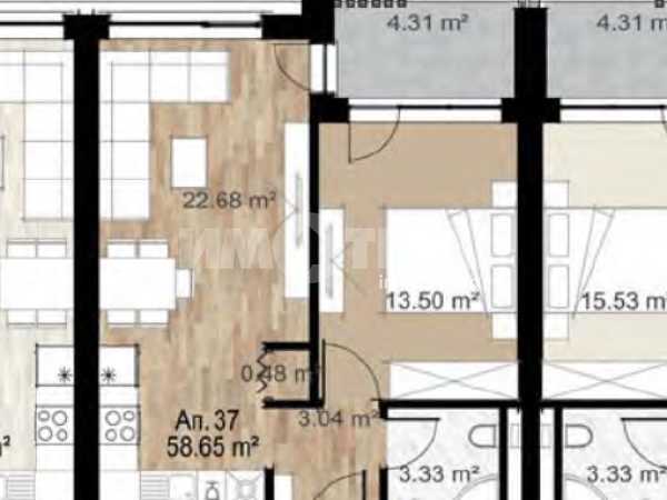 Просторен двустаен апартамент със застроена площ 58,65 кв.м. Състои се от дневна с кухненски бокс, спалня , санитарен възел и тераса. Изложение югозапад.
