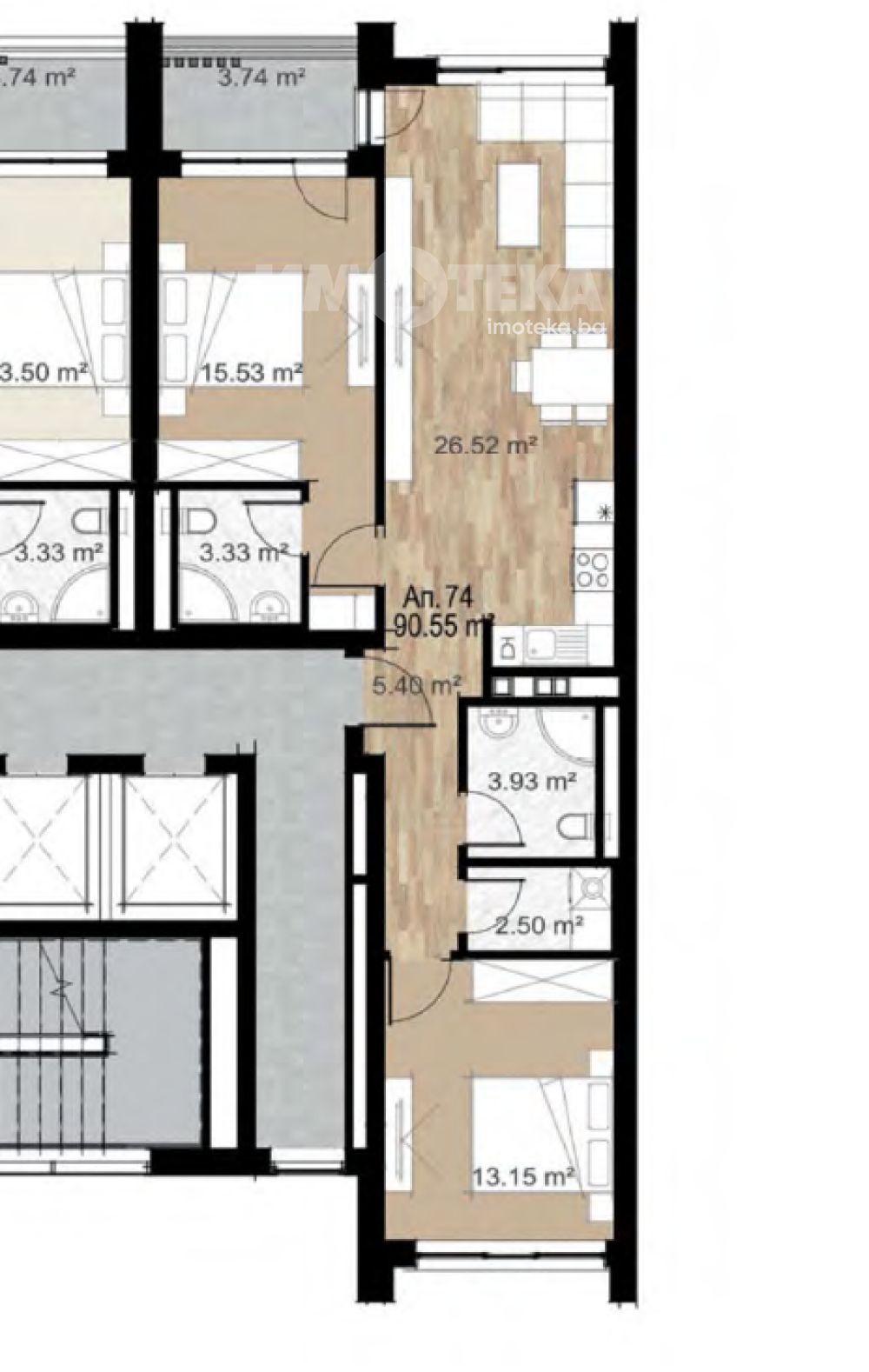 Просторен тристаен, панорамен апартамент със застроена площ 90,55 кв.м. Състои се от дневна с кухненски бокс, две спалня, две санитарни помещения и склад . Изложение югозападно/ североизток