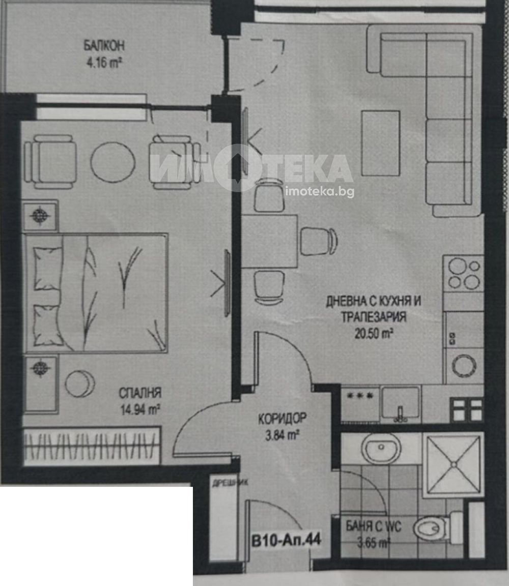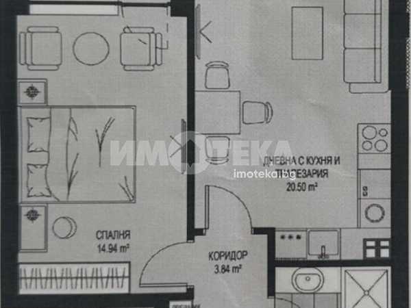 Двустаен апартамент в „СОФИ ЦЕНТЪР”- затворен комплекс, състоящ се от антре, хол с трапезария и кухненски бокс, спалня, тераса с прекрасна гледка и санитарен възел с тоалетна. Такса поддръжка в комплекса е 1,08€ на кв. м. с ДДС. Сграда с АКТ 15 и АКТ 16 до средата на 2026 г.