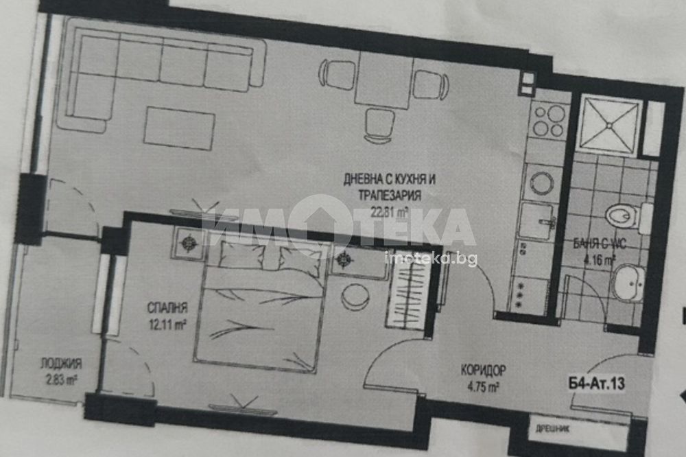 Двустаен апартамент в „СОФИ ЦЕНТЪР”- затворен комплекс, състоящ се от антре, хол с трапезария и кухненски бокс, спалня, тераса с прекрасна гледка и санитарен възел с тоалетна. Такса поддръжка в комплекса е 1,08€ на кв. м. с ДДС. Сграда с АКТ 15 и АКТ 16 до средата на 2026 г.