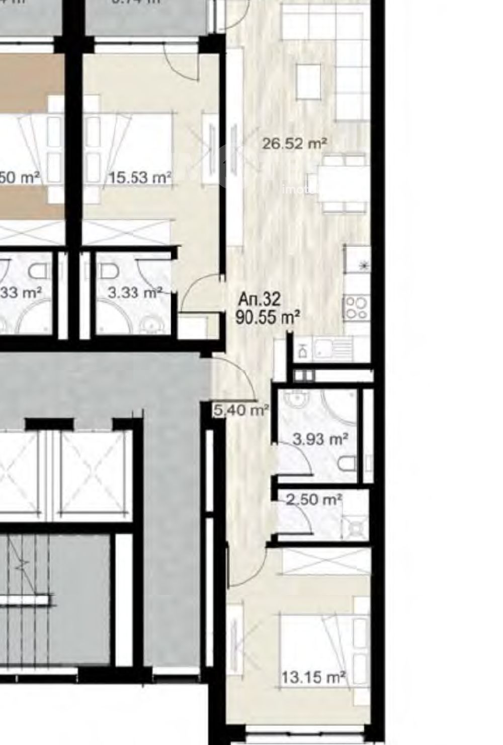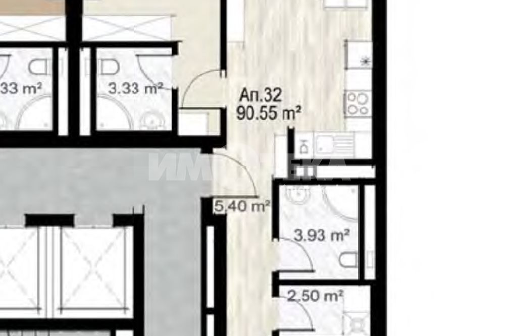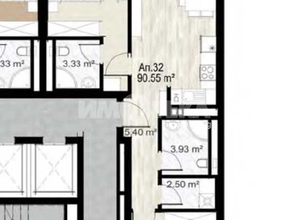 Просторен тристаен апартамент със застроена площ 90,55 кв.м. Състои се от светла дневна с кухненски бокс, две спални, две санитарни помещения и склад.. Изложение югозапад/североизток