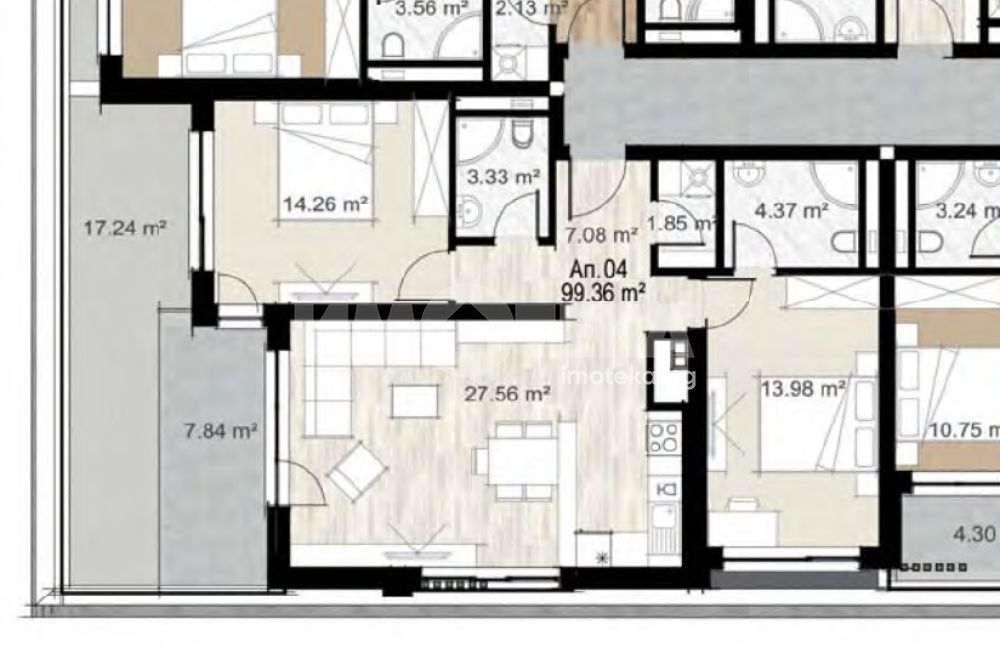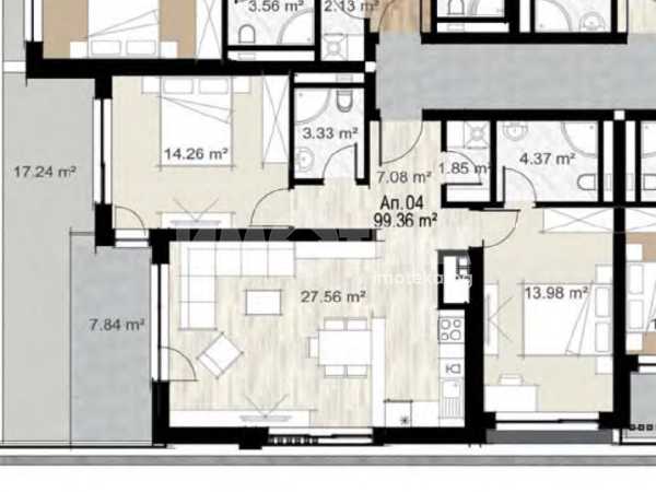 Просторен тристаен апартамент със застроена площ 99,36 кв.м. Състои се от светла дневна с кухненски бокс и хубава тераса, две спални, две санитарни помещения и склад. Изложение югоизток/североизток.