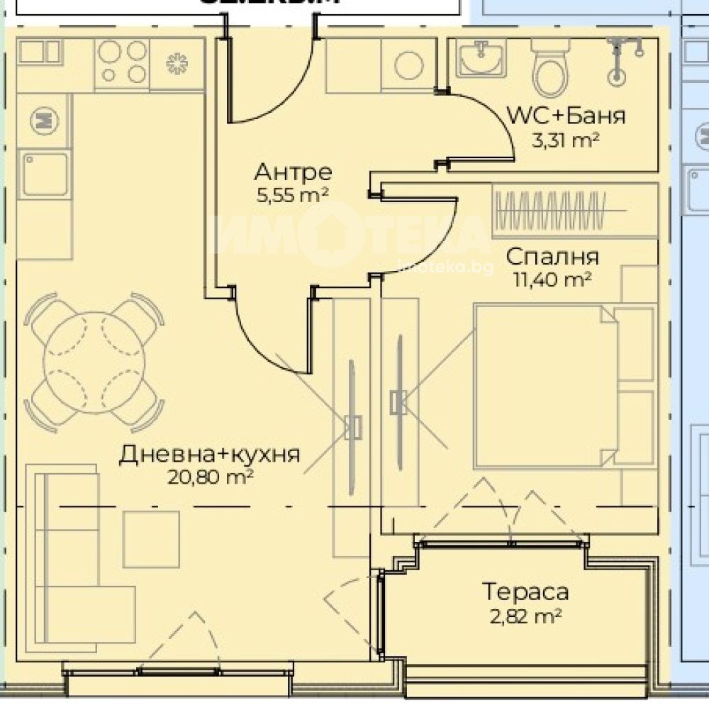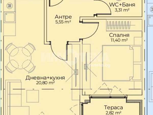 Предлагаме двустаен апартамент, разположен на 3-ти (последен) етаж, без скосявания, с източно изложение. Разпределение: Дневна, спалня, баня, тераса.