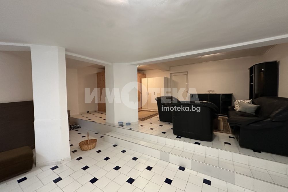 Сутеренно ниво- котелно помещение, голямо помещение с функционалност на дневна, зона за офис, зона за отдих, сауна