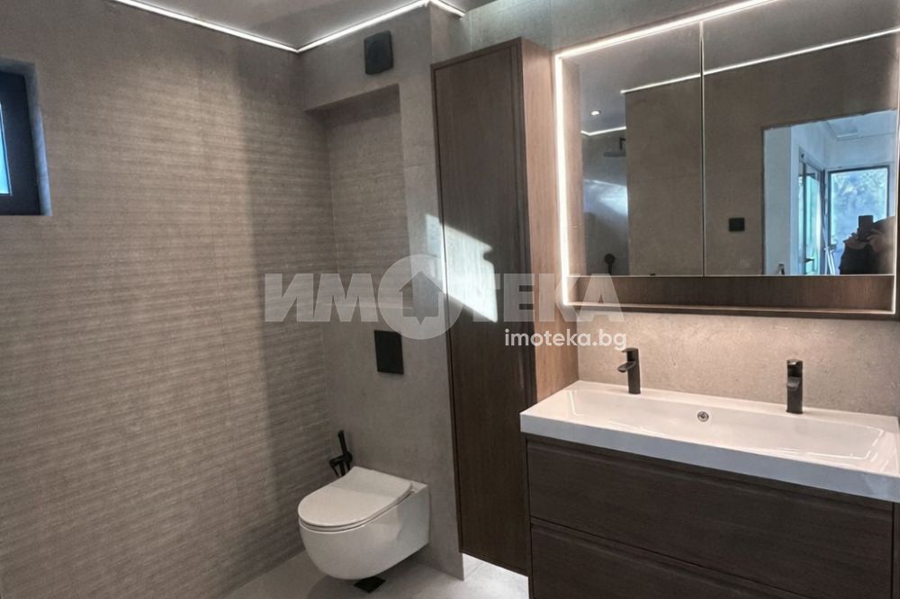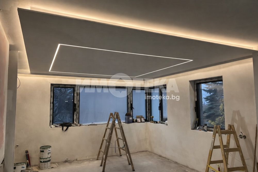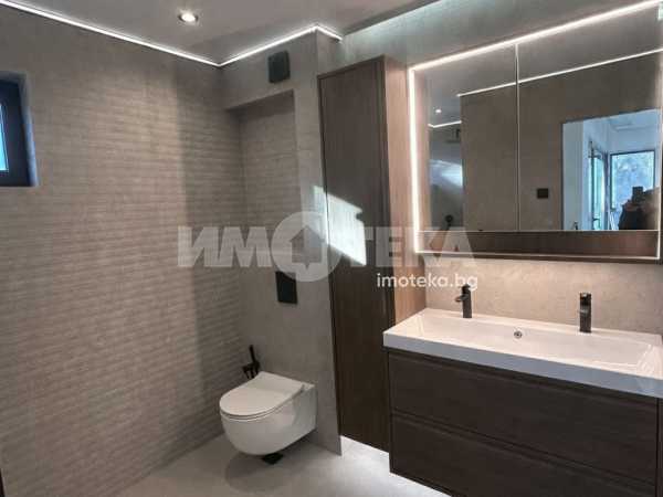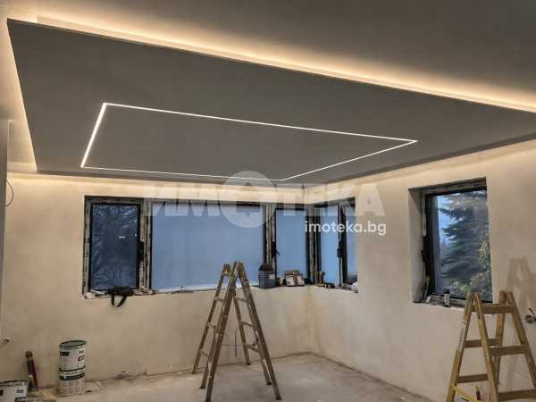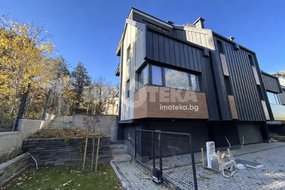 в кв. Симеоново,в близост до 'Охлюва', на 3 мин. с кола от RING MOLL. Имотът разполага с три спални, четири бани, две тераси, два склада, просторен хол с кухня (45м2), двоен гараж и две паркоместа. Без такса за поддръжка. Обекта се издава с четири готови бани включени в цената, както и окачени тавани с лед осветление - изпълнени по интериорен проект. Подово отопление и изводи за конвекторни тела за охлаждане във всички помещения - пълна готовност за монтаж на термопомпа. Автоматична поливна система с WIFI модул за управление, автоматична осветителна система в двора, бельопровод и много други удобства