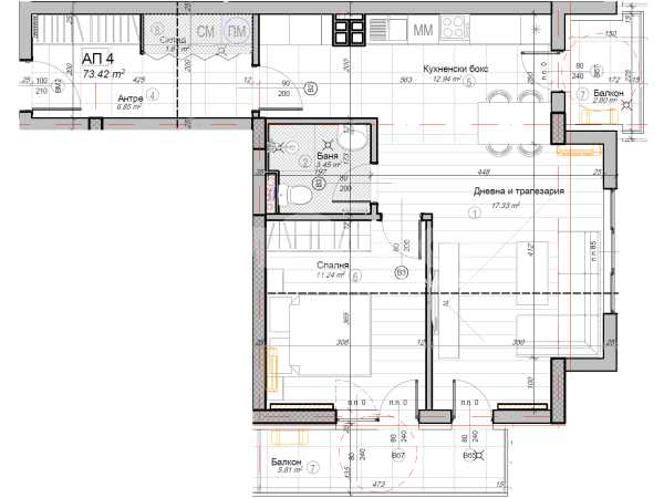 Прекрасен двустаен апартамент на първи етаж над партер на кота +2,85м, с възможност за преустройство в тристаен. Жилището е с РЗП-84.06м2 и ЗП-73,42м2. Апартаментът се състои от: антре, голяма дневна с кухненски бокс и трапезария-30,27м2, спалня-11,24м2, баня с тоалетна-3,45м2 и балкон 5,81м2. Налични ПМ и гаражи. Цените са крайни с включен ДДС.