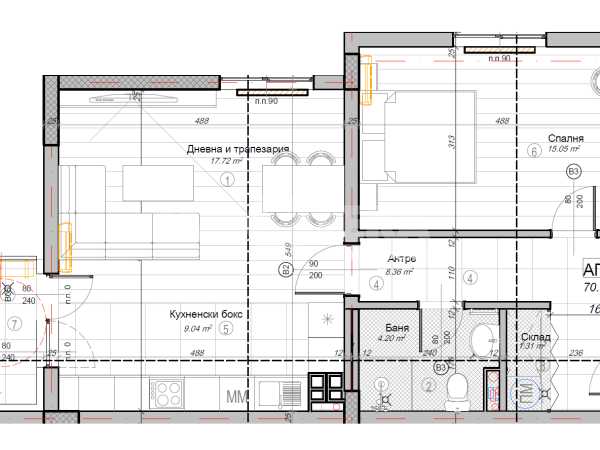 Прекрасен двустаен апартамент на първи етаж над партер на кота +2,85м. Жилището е с РЗП-81,21м2 и ЗП-70,93м2. Апартаментът се състои от: антре, голяма дневна с кухненски бокс и трапезария-26,76м2, голяма спалня-15,05м2, баня с тоалетна-4,20м2, склад и балкон-3,43м2. Налични ПМ и гаражи. Цените са крайни с включен ДДС.