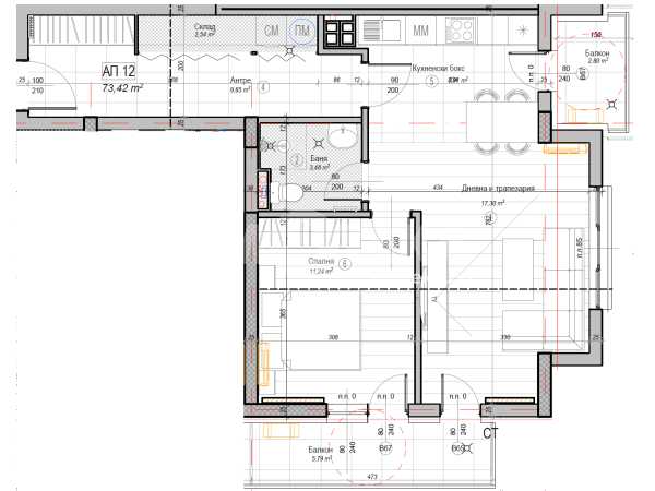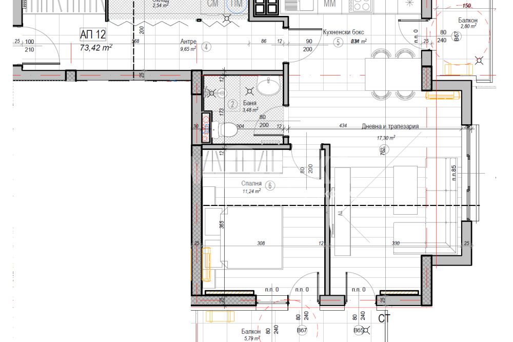 Прекрасен двустаен апартамент на етаж трети на кота +5,70м, с възможност за преустройство в тристаен. Жилището е с РЗП-84.06м2 и ЗП-73,42м2. Апартаментът се състои от: антре, голяма дневна с кухненски бокс и трапезария-25,64м2, спалня-11,24м2, баня с тоалетна-3,48м2 и балкон -2,80м2. Налични ПМ и гаражи. Цени с ДДС. Без комисион.