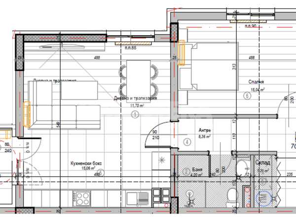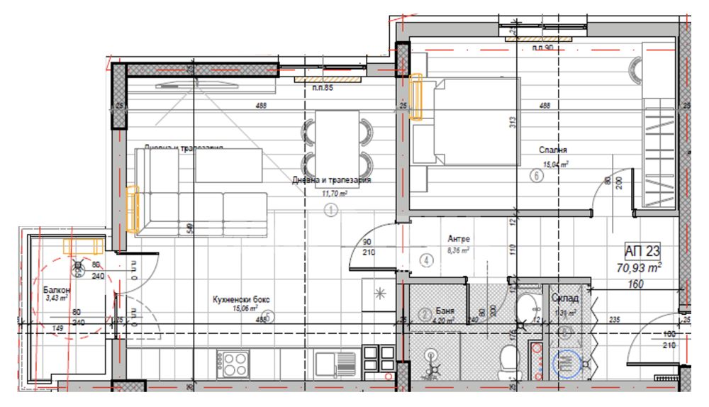 Прекрасен двустаен апартамент на трети етаж на кота +8,55м. Жилището е с РЗП-81,21м2 и ЗП-70,93м2. Апартаментът се състои от: антре, голяма дневна с кухненски бокс и трапезария-26,57м2, голяма спалня-15,04м2, баня с тоалетна-4,20м2, склад и балкон-3,43м2. Налични ПМ и гаражи. Цените са крайни с включен ДДС. Без комисион.