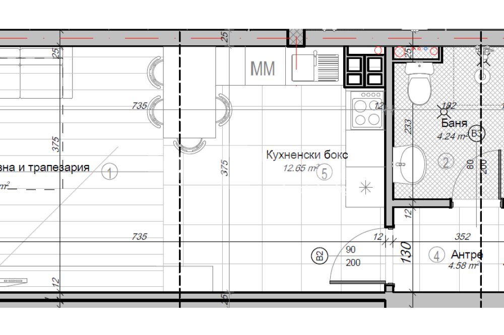Просторен едностаен апартамент с РЗП-52,52м2, ЗП-45,87м2, разположен първи етаж над партер на кота +2,85, състоящ се от антре-4,58м2, една голяма стая с кухненски бокс и трапезария-27,54, баня с тоалетна-4,24м2 и склад-3,68м2. Към апартамента има и мазе с площ от 4,98м2. Налични ПМ и гаражи. Цени с ДДС. Без комиксион.