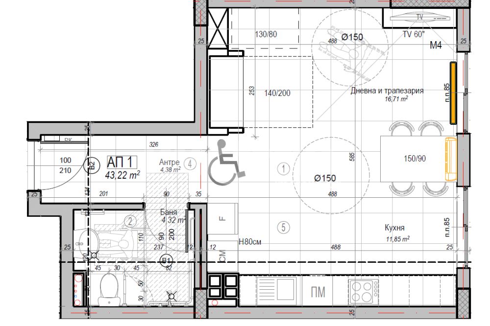 Просторен едностаен апартамент на партер с РЗП-49.49м2, ЗП-43.22м2, разположен на партер, състоящ се от антре, една голяма стая с кухненски бокс и трапезария, баня с тоалетна. Към апартамента има и склад-4,98м2. Налични ПМ и гаражи. Цени с ДДС. Без комиксион.