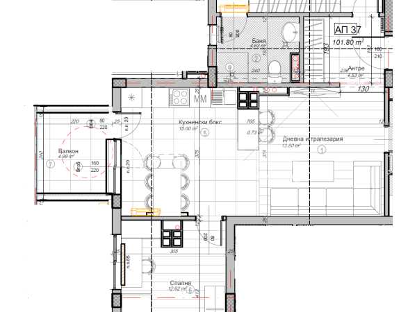 Разкошен тристаен апартамент на шести последен етаж. Жилището е с РЗП-116,56м2 и ЗП-101,80м2. Изключително компактно жилище с отлично разпределение: антре, дневна с кухненски бокс и трапезария-28,8м2 с излаз на балкон-4,99м2, две спални-12,62м2 с излаз на балкон-4,82м2, втора спалня-15,39м2 с излаз на балкон-2,23м2, баня с тоалетна-4,63м2 и склад. Налични ПМ и гаражи. Цени с ДДС. Без комисион.