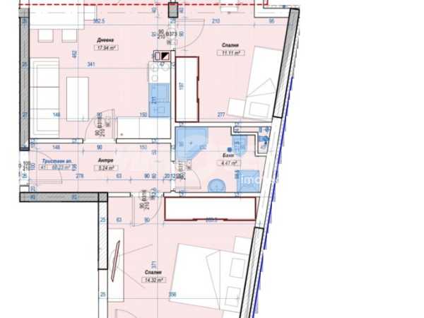 Разпределение: всекиднвна, две спални, баня с тоалетна, коридор и балкон.