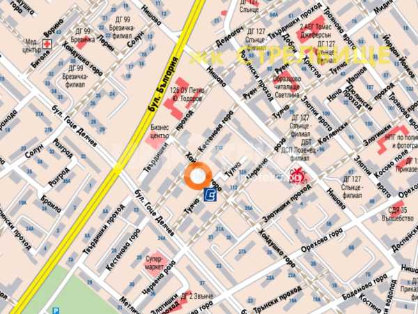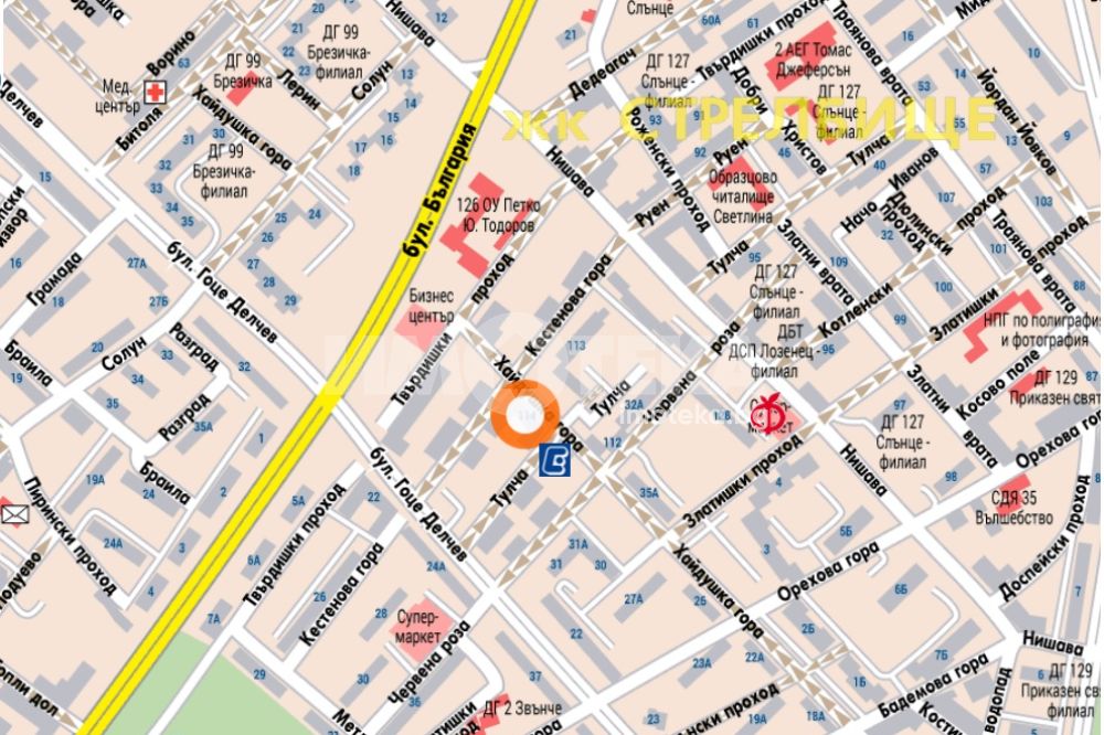 кв. Стрелбище - ул. "Кестенова гора" и ул. "Хайдушка гора". Тихо място и в близостдо комуникациите по бул. България и Гоце Делчев, до спирки на автобуси 64, 73, 83, 204, трамвай 7, близо до метростанция "Бул. България".