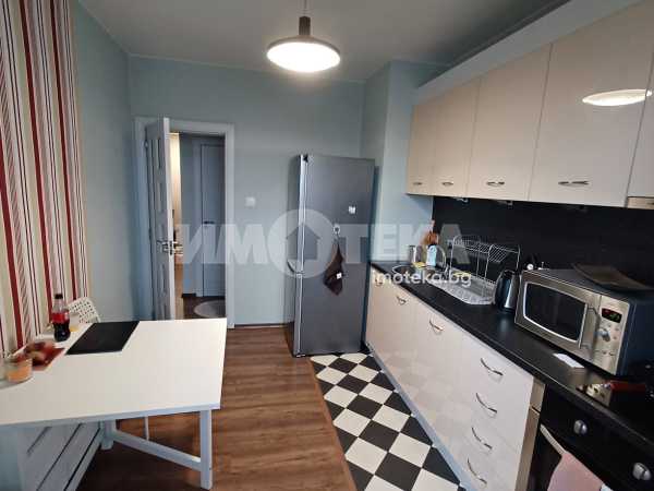 Имотът се намира на 3-ти жилищен етаж в сграда с добре поддържани общи части. Разпределение: голям хол с голяма тераса, отделна кухня с балкон, две спални, баня, тоалетна и входно антре.