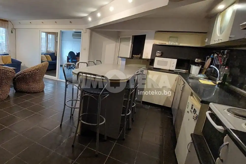 Два гаража са обединени и направени като жилище. Има дневна с трапезария, преход към спалня, голяма баня с тоалетна и вана. Към банята има сушилно, което е преградено с гипсокартон и може да се премахне и така да се увеличи площта на спалнята. Кухнята е изцяло обзаведена и оборудвана с уреди. Отопление с климатици. Топла вода с бойлер. До момента е отдавано под наем за живеене. Застроената площ на двата гаража общо е 58 кв.м, всеки един по 29 кв.м.