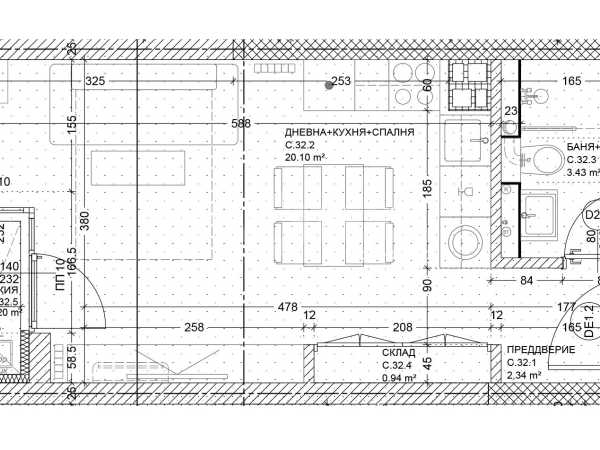 Входно антре, всекидневна с кухненски бокс и трапезария, баня с тоалетна и лоджия.