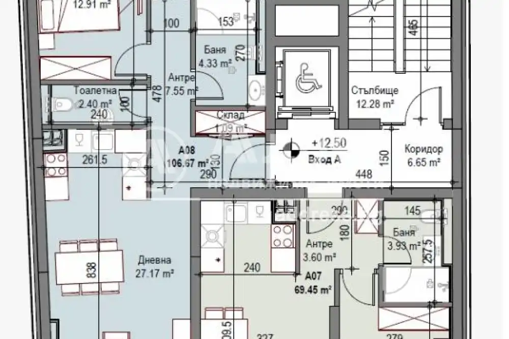 Просторен тристаен апартамент. Състои се от: две спални, дневна с кухненски бокс, две бани с тоалетни, мокро помещение и две тераси. Изложението е север-юг.
