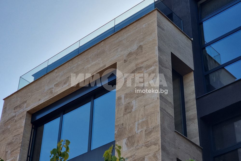 - Изпълнение на сградата: вентилируема, окачена фасада с естествен камък травертин.