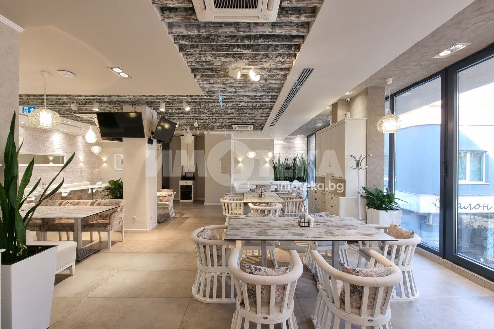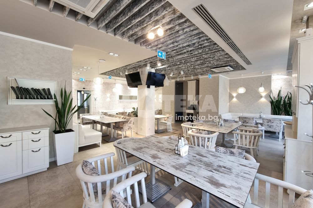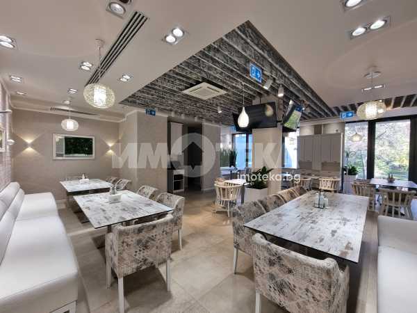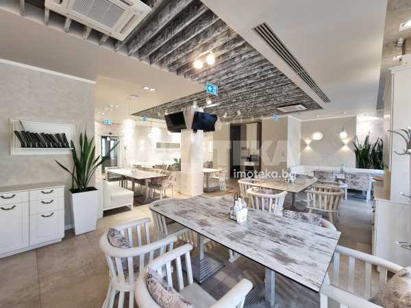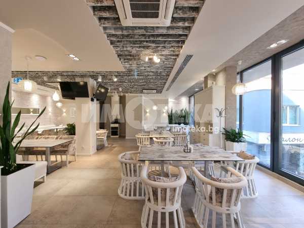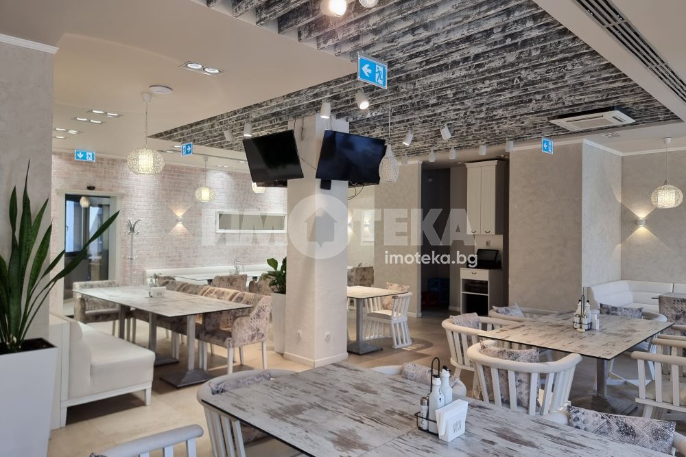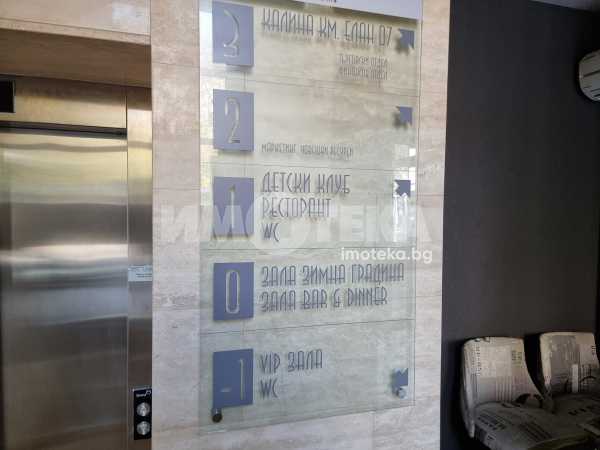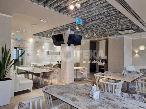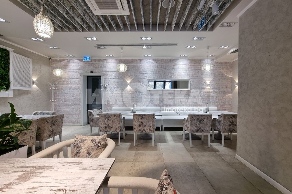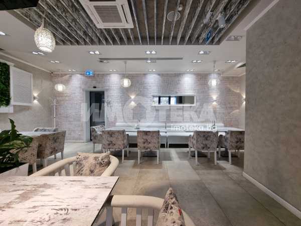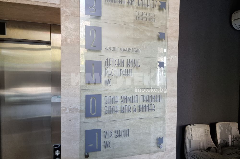 Изключително луксозна, нова бизнес сграда на четири етажа с РЗП 1238 кв.м. Еталон на лукса и професионализма в строителството! Изпълнение с висококачествени материали и с прецизност до най-малкия детайл. Архитектурата е модерна смесица от изчистени линии, комбинация от различни материали и много светлина. Разпределение: административна част - офиси на 2 нива с хубави, панорамни тераси, VIP зала, ресторант на три нива, детски клуб за игри, професионална кухня, хладилни помещения, технически помещения, складове, санитарни помещения и др. Височина на помещенията 340см. Голяма, лятна градина, която вдига капацитета на заведението с още 140 седящи места през топлите месеци.