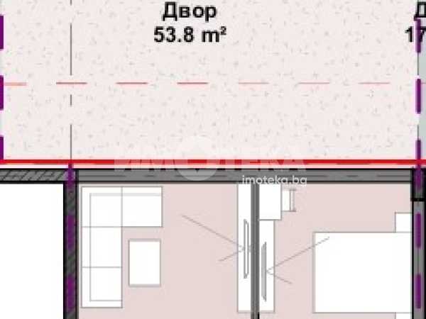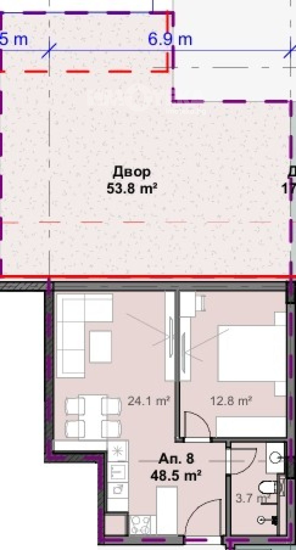 Двустаен апартамент разпределен както следва - дневна с кухненски бокс, спалня, баня с тоалетна и двор 53.8 м2