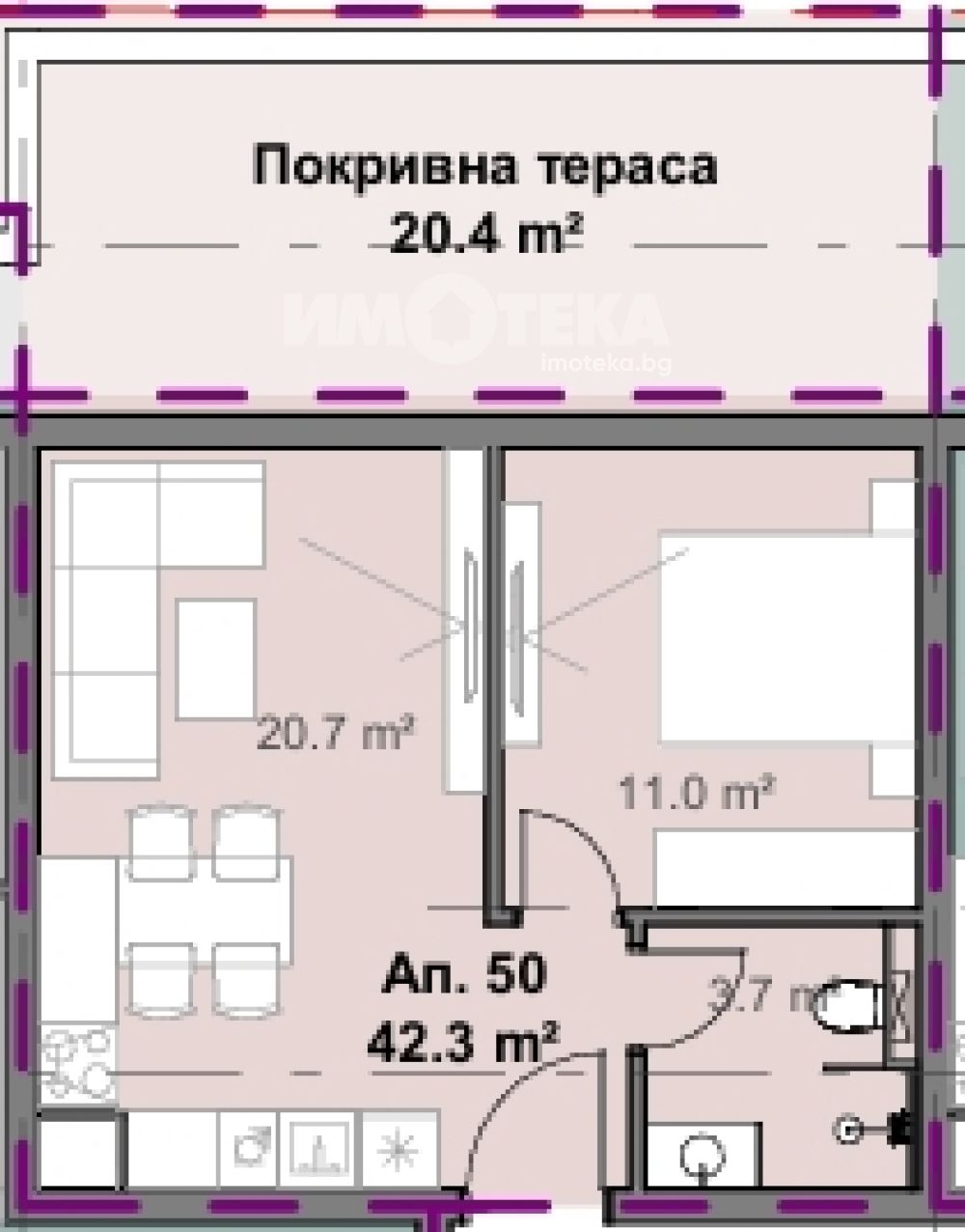 Двустаен апартамент разпределен както следва - дневна с кухненски бокс, спалня, баня с тоалетна и покривна тераса - 20.4 м2