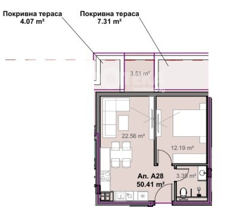 Двустаен апартамент разпределен както следва - дневна с кухненски бокс, баня с тоалетна, спалня и тераса