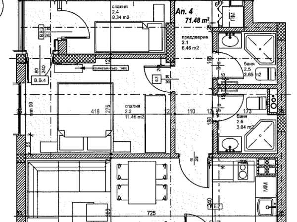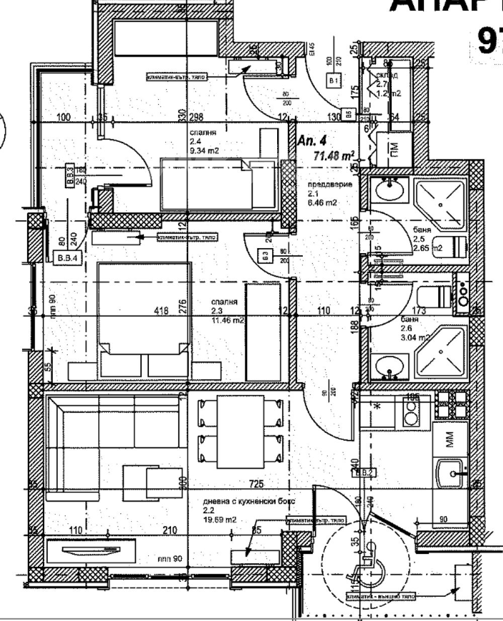 Просторен тристаен апартамент със следното разпределение: дневна с кухненски бокс, две спални, две тераси, две баня с тоалетна и склад. Към апартаментите има възможност за покупка на паркомясто или гараж.