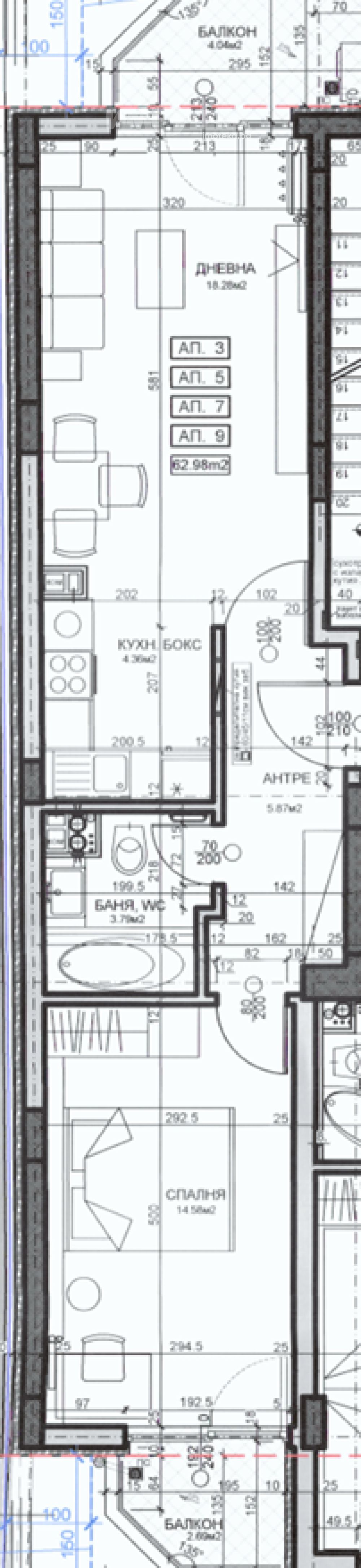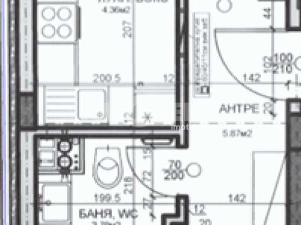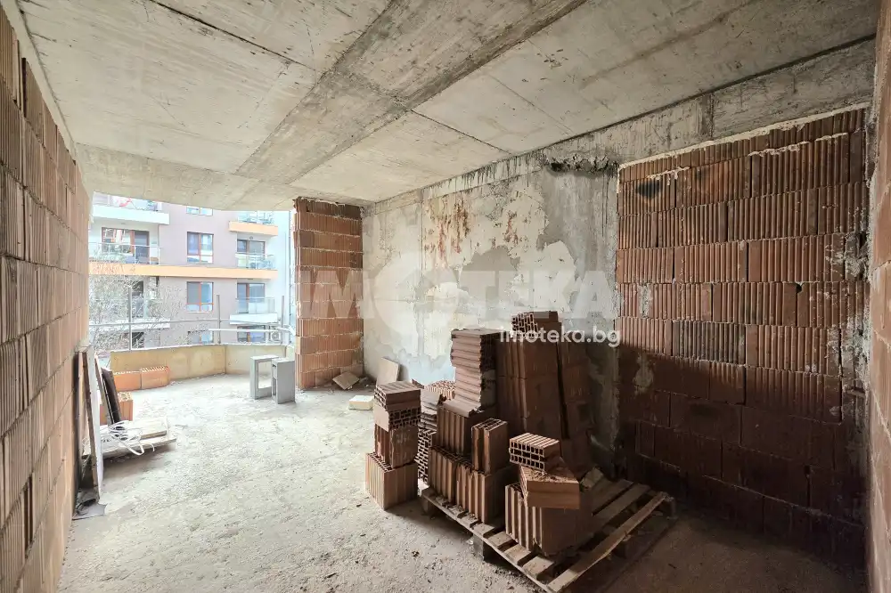 Двустаен апартамент в новострояща се сграда със следното разпределение, входно антре, дневна с кухненски бокс, санитарно помещение, спалня и два балкона.
