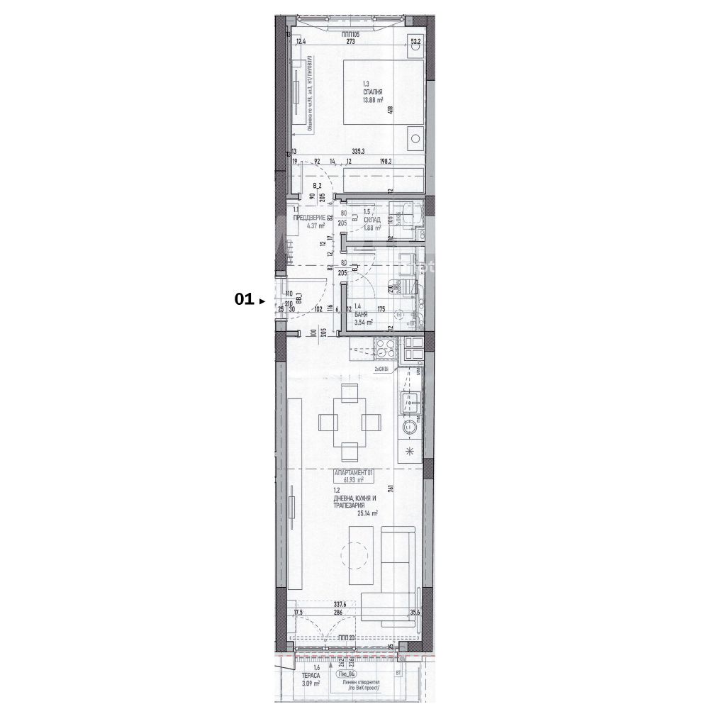 Дневна с бокс, тераса, спалня, баня с wc, килер.