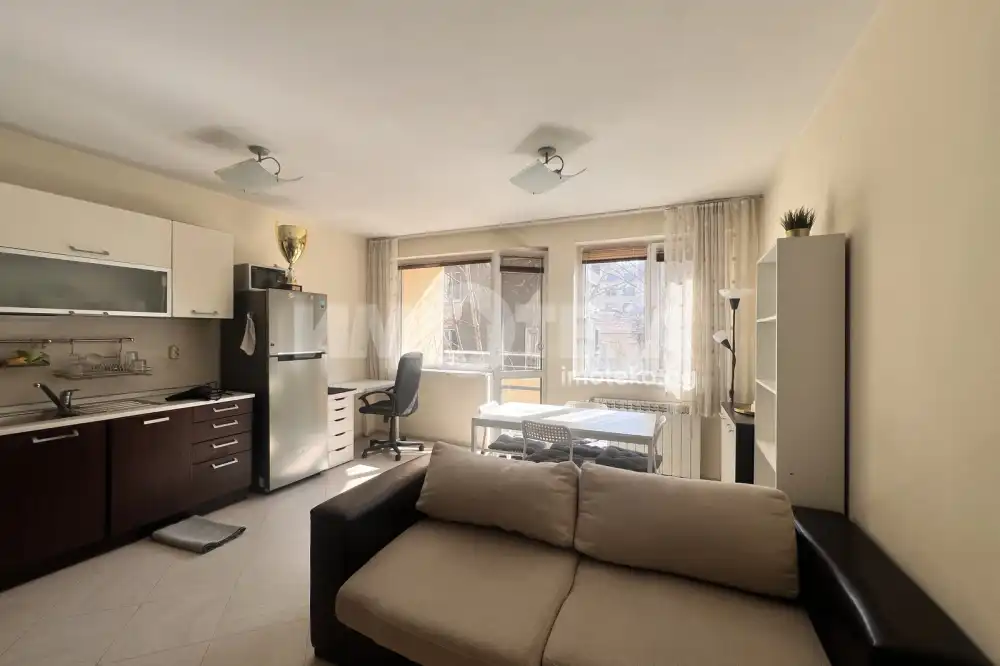 Предлагаме Ви двустаен апартамент, напълно обзаведен . Разполагащ с хол, кухненски бокс, отделна спалня, баня с тоалетна и приятна тераса. При наемане, наемателят заплаща два депозита.