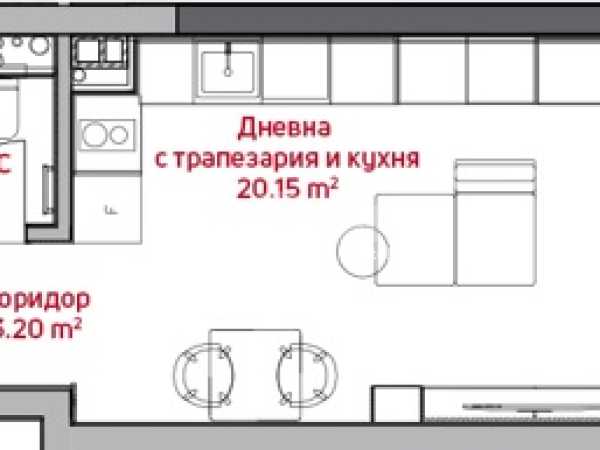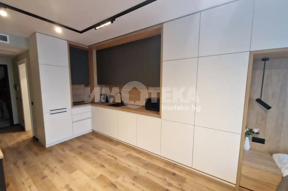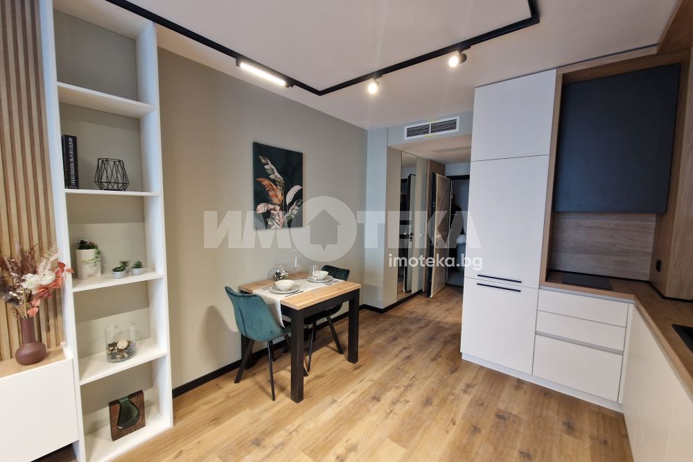 Без Комисионна. Напълно обзаведен едностаен апартамент състоящ се от дневна с кухненски бокс, спален кът, и бани с тоалетна.