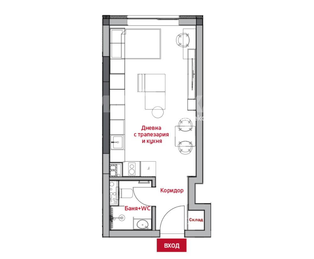 Цената е за довършенo жилище с готова баня, настилки, латекс, интериорни врати и первази. Еднопространствен апартамент с обособено място за спалня, дневна зона и кухненски бокс.