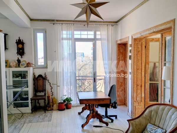 Светъл и артистичен многостаен апартамент в реновирана сграда, на централна локация в гр.София, с площ 119,82кв.м. /без терасите/, с високи тавани и следното разпределение : входно антре, обособена гардеробна, просторна и слънчева всекидневна, трапезария с кухненски бокс, три самостоятелни и светли спални с правилни форми, баня с тоалетна, отделна тоалетна, два балкона. Височината на таваните - 3,10м.