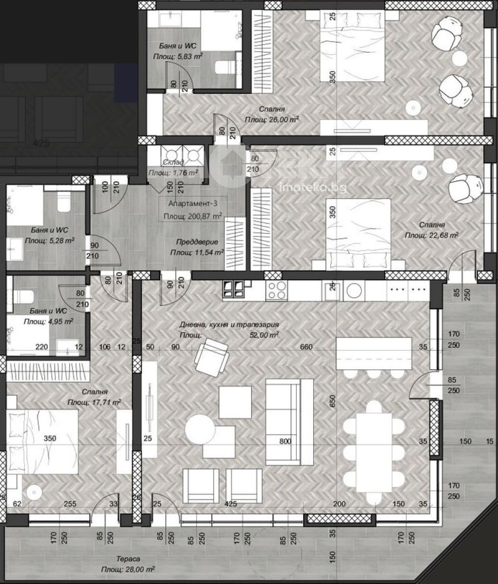 Фасадното остъкляване осигурява максимално естествено осветление във всяко жилищно помещение. Немски алуминиеви профил с троен стъклопакет Schüco.