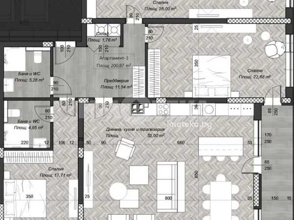Просторен многостаен апартамент с югозападно изложение, състоящ се от антре, просторна дневна с кухненски бокс, три спални с дрешник, складово помещение, три бани с тоалетна и панорамна тераса. Жилището е разположено в елегантна и престижна сграда в центъра на София, съчетаваща модерна архитектура с изчистен дизайн и впечатляващо фасадно остъкляване, което осигурява простор и светлина. Намира се на комуникативно място с удобен достъп до подземен и надземен паркинг, в непосредствена близост до ключови транспортни връзки и удобства.