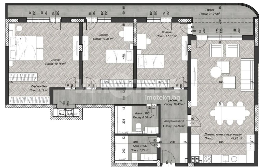 Фасадното остъкляване осигурява максимално естествено осветление във всяко жилищно помещение. Немски алуминиеви профил с троен стъклопакет Schüco.