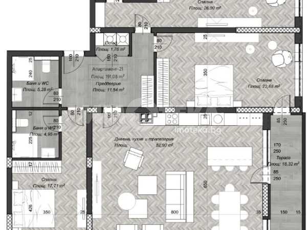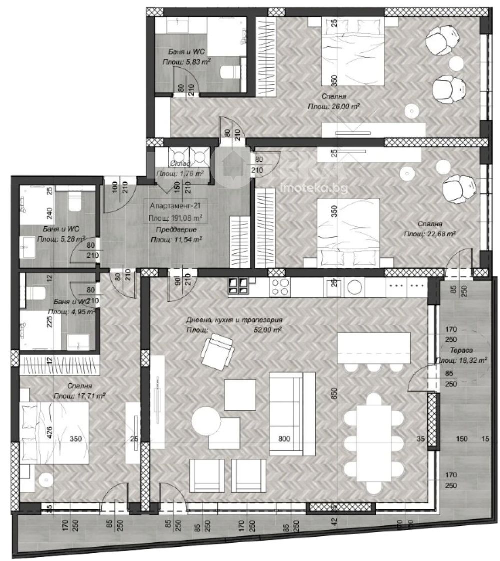 Многостаен апартамент с югозападно изложение, състоящ се от антре, просторна дневна с кухненски бокс, три спални, складово помещение, три бани с тоалетна и тераса. Жилището е разположено в елегантна и престижна сграда в центъра на София, съчетаваща модерна архитектура с изчистен дизайн и впечатляващо фасадно остъкляване, което осигурява простор и светлина. Намира се на комуникативно място с удобен достъп до подземен и надземен паркинг, в непосредствена близост до ключови транспортни връзки и удобства.
