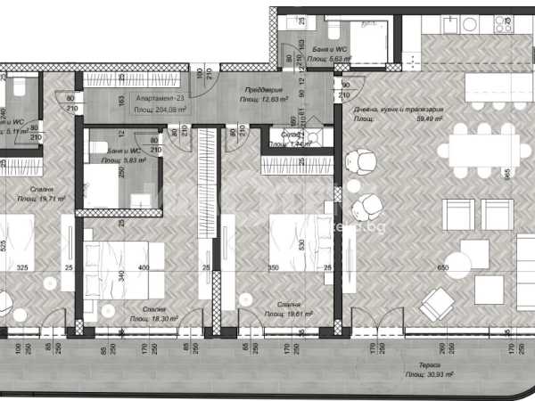Многостаен апартамент със западно изложение, състоящ се от антре, просторна дневна с кухненски бокс, три спални, складово помещение, три бани с тоалетна и тераса. Жилището е разположено в елегантна и престижна сграда в центъра на София, съчетаваща модерна архитектура с изчистен дизайн и впечатляващо фасадно остъкляване, което осигурява простор и светлина. Намира се на комуникативно място с удобен достъп до подземен и надземен паркинг, в непосредствена близост до ключови транспортни връзки и удобства.