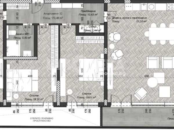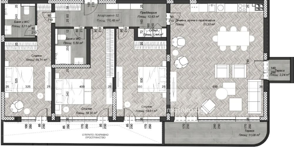 Многостаен апартамент с югозападно изложение, състоящ се от антре, просторна дневна с кухненски бокс и трапезария, три спални, складово помещение, две бани с тоалетна и две тераси, плюс покривно пространство с размери от 19 кв.м .Жилището е разположено в елегантна и престижна сграда в центъра на София, съчетаваща модерна архитектура с изчистен дизайн и впечатляващо фасадно остъкляване, което осигурява простор и светлина. Намира се на комуникативно място с удобен достъп до подземен и надземен паркинг, в непосредствена близост до ключови транспортни връзки и удобства.