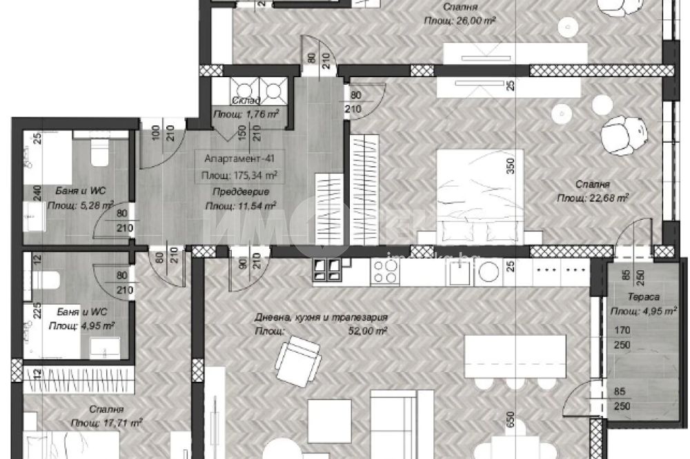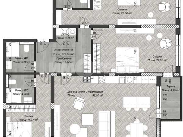 Многостаен апартамент с югозападно изложение, състоящ се от антре, просторна дневна с кухненски бокс и трапезария, три спални, складово помещение, три бани с тоалетна и тераса, плюс покривно пространство с размер от 19 кв.м. Жилището е разположено в елегантна и престижна сграда в центъра на София, съчетаваща модерна архитектура с изчистен дизайн и впечатляващо фасадно остъкляване, което осигурява простор и светлина. Намира се на комуникативно място с удобен достъп до подземен и надземен паркинг, в непосредствена близост до ключови транспортни връзки и удобства.