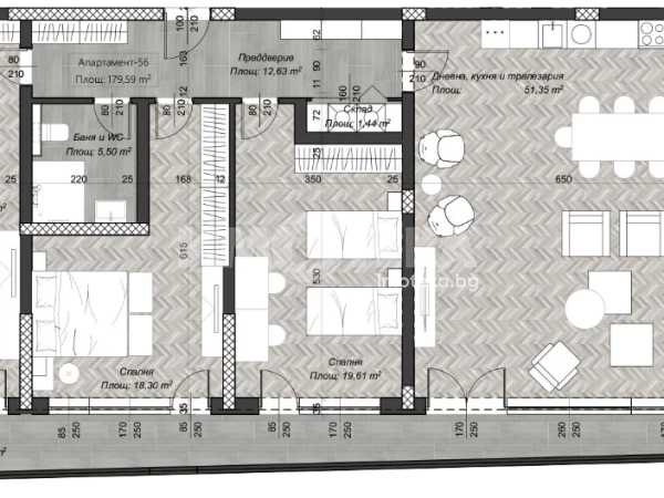 Многостаен апартамент с югозападно изложение, състоящ се от антре, просторна дневна с кухненски бокс и трапезария, три спални, складово помещение, две бани с тоалетна и две тераси. Жилището е разположено в елегантна и престижна сграда в центъра на София, съчетаваща модерна архитектура с изчистен дизайн и впечатляващо фасадно остъкляване, което осигурява простор и светлина. Намира се на комуникативно място с удобен достъп до подземен и надземен паркинг, в непосредствена близост до ключови транспортни връзки и удобства.
