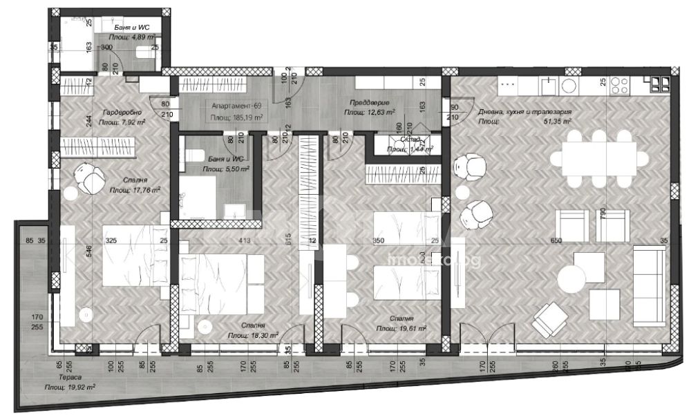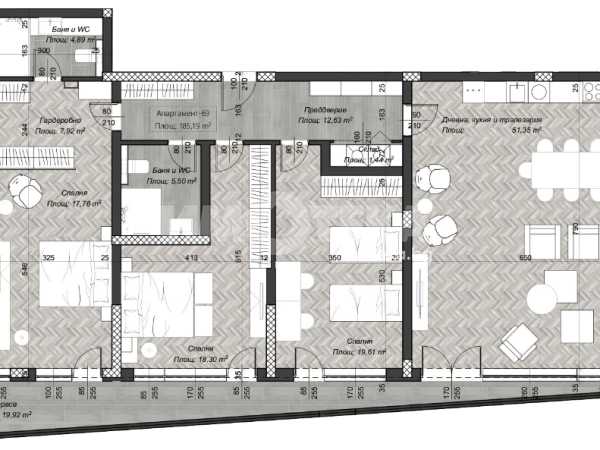 Многостаен апартамент със западно изложение, състоящ се от антре, просторна дневна с кухненски бокс и трапезария, три спални, складово помещение, две бани с тоалетна и тераса. Жилището е разположено в елегантна и престижна сграда в центъра на София, съчетаваща модерна архитектура с изчистен дизайн и впечатляващо фасадно остъкляване, което осигурява простор и светлина. Намира се на комуникативно място с удобен достъп до подземен и надземен паркинг, в непосредствена близост до ключови транспортни връзки и удобства.