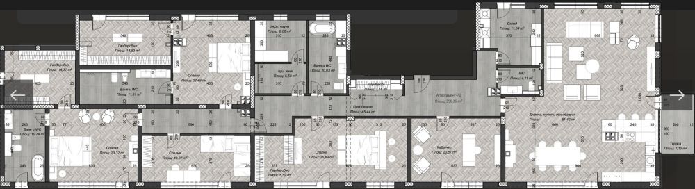 Уникален самостоятелен на етаж, панорамен пентхаус на три изложения - изток/югозапад, състоящ се от антре, просторна дневна с кухненски бокс и трапезария, пет спални - всяка с дрешник към нея, складово помещение, четири бани с тоалетна, зона за релакс със сауна и тераса. С възможност за обособяване на допълнителни помещения. Жилището е разположено в елегантна и престижна сграда в центъра на София, съчетаваща модерна архитектура с изчистен дизайн и впечатляващо фасадно остъкляване, което осигурява простор и светлина. Намира се на комуникативно място с удобен достъп до подземен и надземен паркинг, в непосредствена близост до ключови транспортни връзки и удобства.