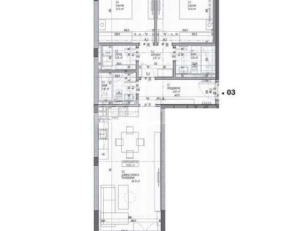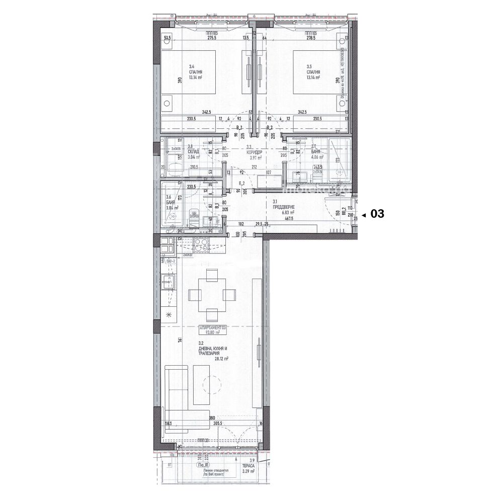 дневна с бокс, две бани с wc, килер, тераса, две спални.